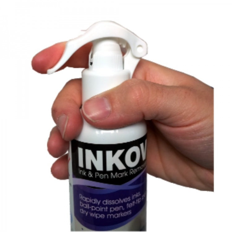 Inkov rapidly dissolves inks, ball-point pen, felt-tip pen, dry wipe markers and permanent marker from hard surfaces and solvent resistant fabrics.