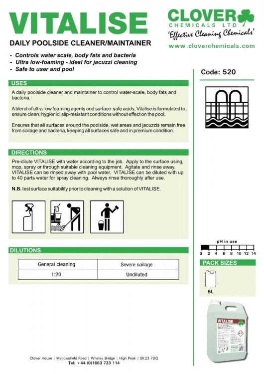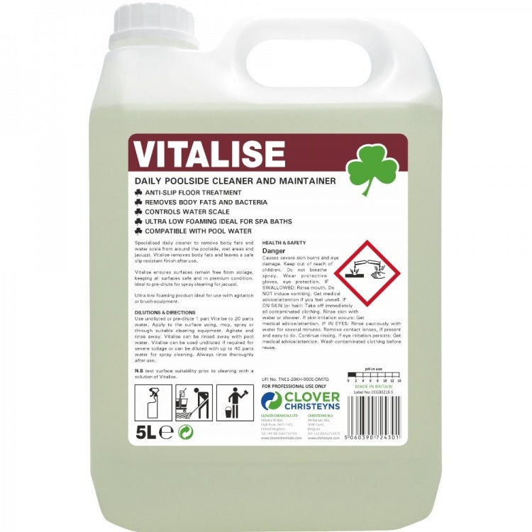 VITALISE DAILY POOLSIDE CLEANER/MAINTAINER is a blend of low foaming agents and surface safe acids formulated to control water scale, body fats and bacteria, ensuring hygienic, slip resistant cleaning to poolside areas, wet areas and jacuzzis.