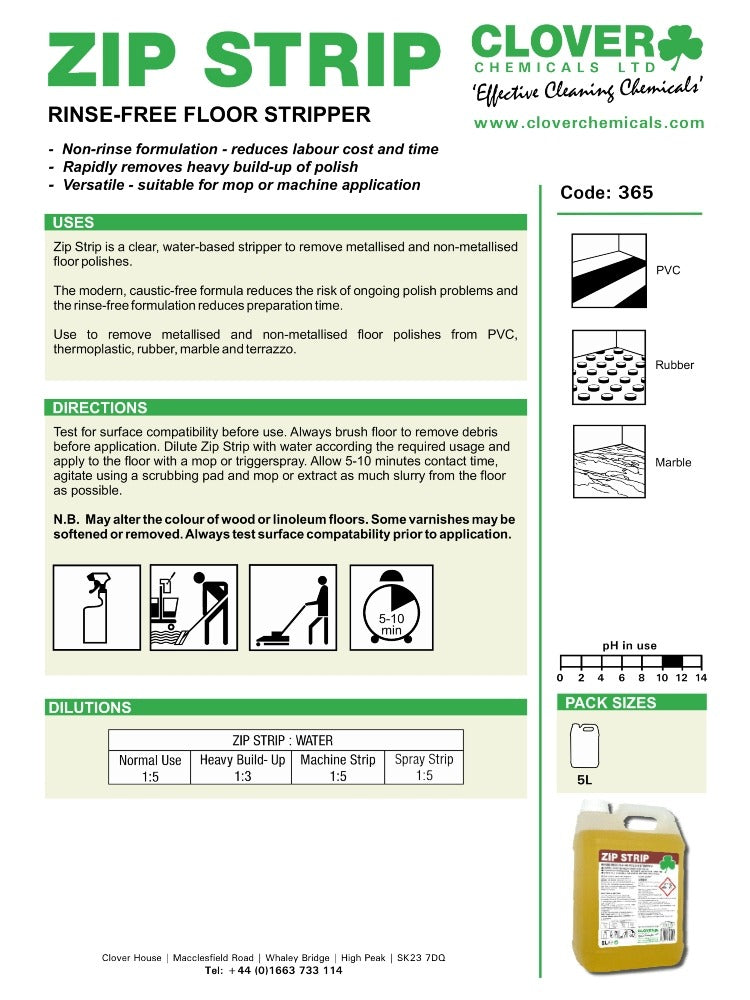 Clover Chemicals Zip Strip Rinse Free Floor Polish Stripper 5 Ltr