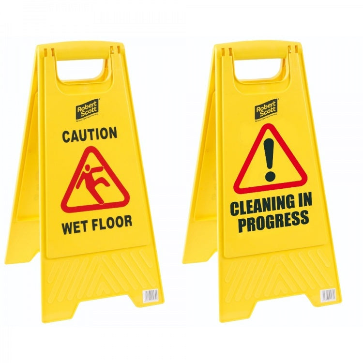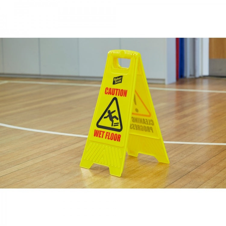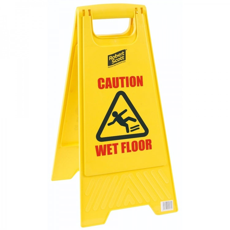 A great value double sided A frame sign to warn against potential hazards from wet floor surfaces during and after cleaning or spillages. Made from vivid yellow plastic with bright red/black graphics. No assembly needed, folds flat for easy storage.