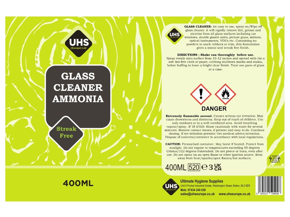 Glass Cleaner 400ml - Ammonia Formulation, Smear & Streak Free - UHS EUROPE