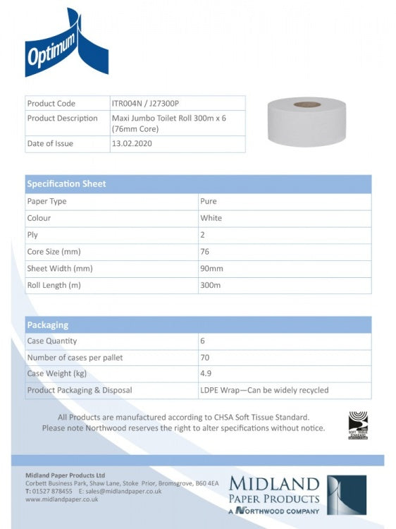 Jumbo Toilet Roll 300m - 76mm (6 Pack)