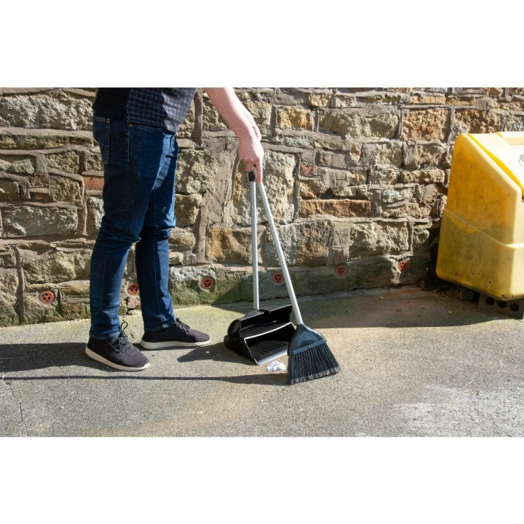 Good value dustpan and brush set for everyday litter and dust clearing. Dustpan has a rubber lip to keep it flush to the floor, and swing-up action to collect debris efficiently. Lightweight brush clips to dustpan handle, and the set hangs up for easy storage when not in use.