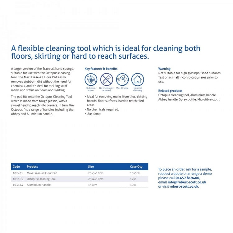 A larger version of the Erase-all hand sponge, suitable for use with the Octopus cleaning tool . It easily removes stubborn dirt without the need for chemicals. Ideal for tackling scuff marks and stains on floors and skirting.
