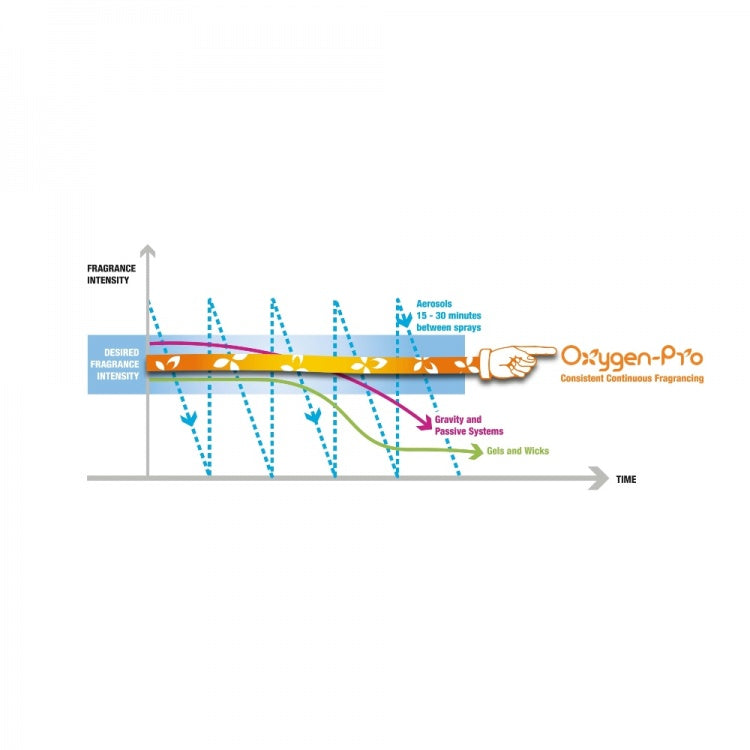 Unlike aerosols, the Oxygen-Pro system does not contain any CFCs, has no added VOCs or propellants, no spray and fade effect and no noise. A fresh, constant level of fragrance is released continuously, consistently and discreetly. The cartridges can be safely disposed of in a plastic recycling bin at the end of the cartridge life.