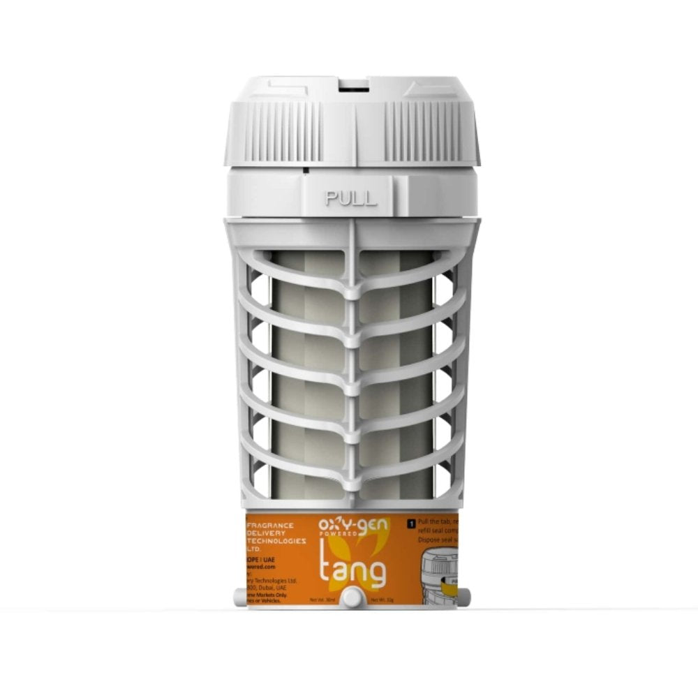 Oxygen is pumped into the sealed chamber of the refill and deplaces the fragrance from the chamber, delivering a specified dose of fragrance onto the cellulose filter continuously. Fragrance molecules are then dispersed by natural air movement.