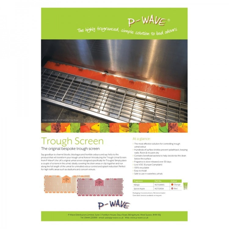 To use, simply place a few screens in your urinal, covering the drain areas to prevent debris blockages or link them to span the urinal's entire length. Known for its potent, high-powered fragrance, the P-Wave® Trough Urinal Screen mirrors the same quality and freshness you've come to expect from the UK's leading brand of urinal screens.