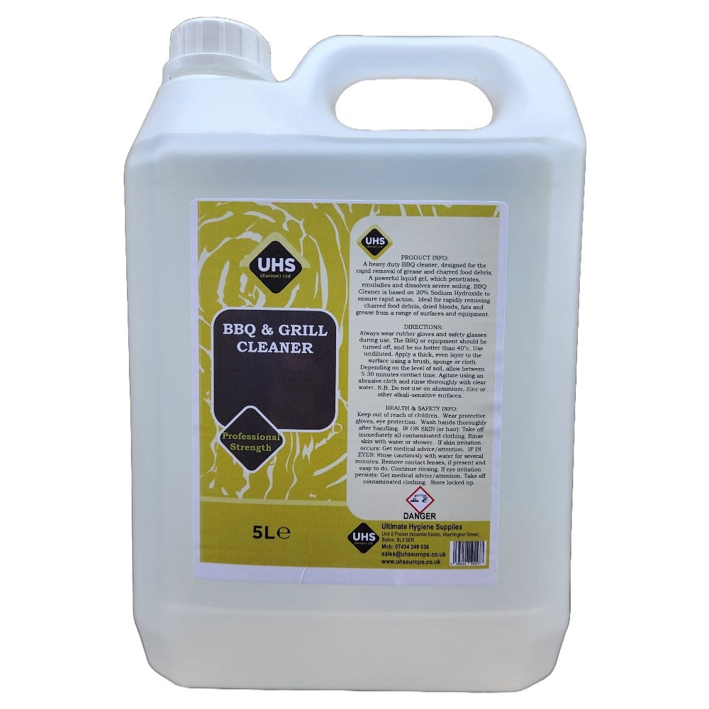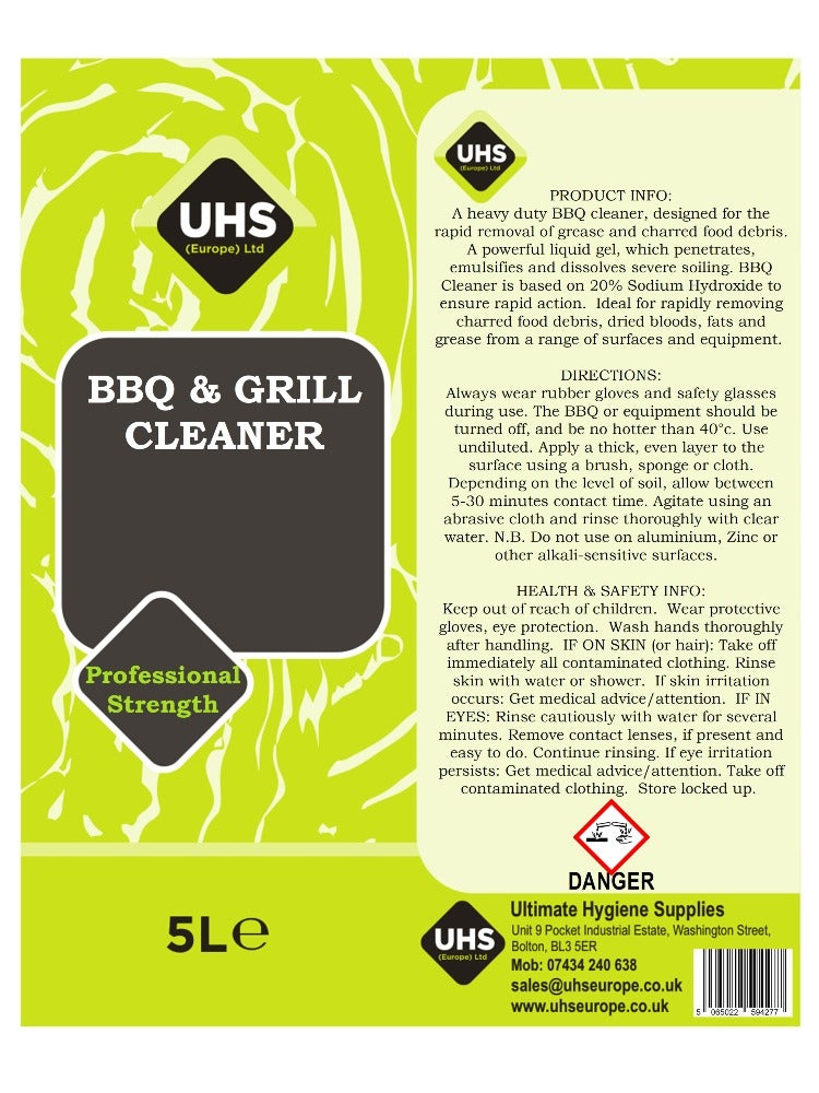 A heavy duty BBQ cleaner, designed for the rapid removal of grease and charred food debris. A powerful liquid gel, which penetrates, emulsifies and dissolves severe soiling. Our BBQ & Grill Cleaner is based on 20% Sodium Hydroxide to ensure rapid action. Ideal for rapidly removing charred food debris, dried bloods, fats and grease from a range of surfaces and equipment. Can be used as a heavy duty drain cleaner.