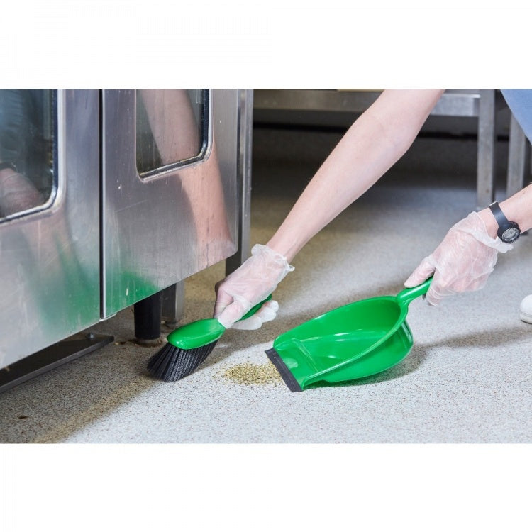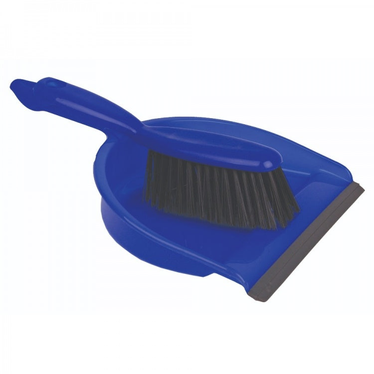 A professional quality dustpan and brush set with stiff bristles, made from tough, hard wearing plastic. The dustpan has a rubber lip at the front for better dirt collection.